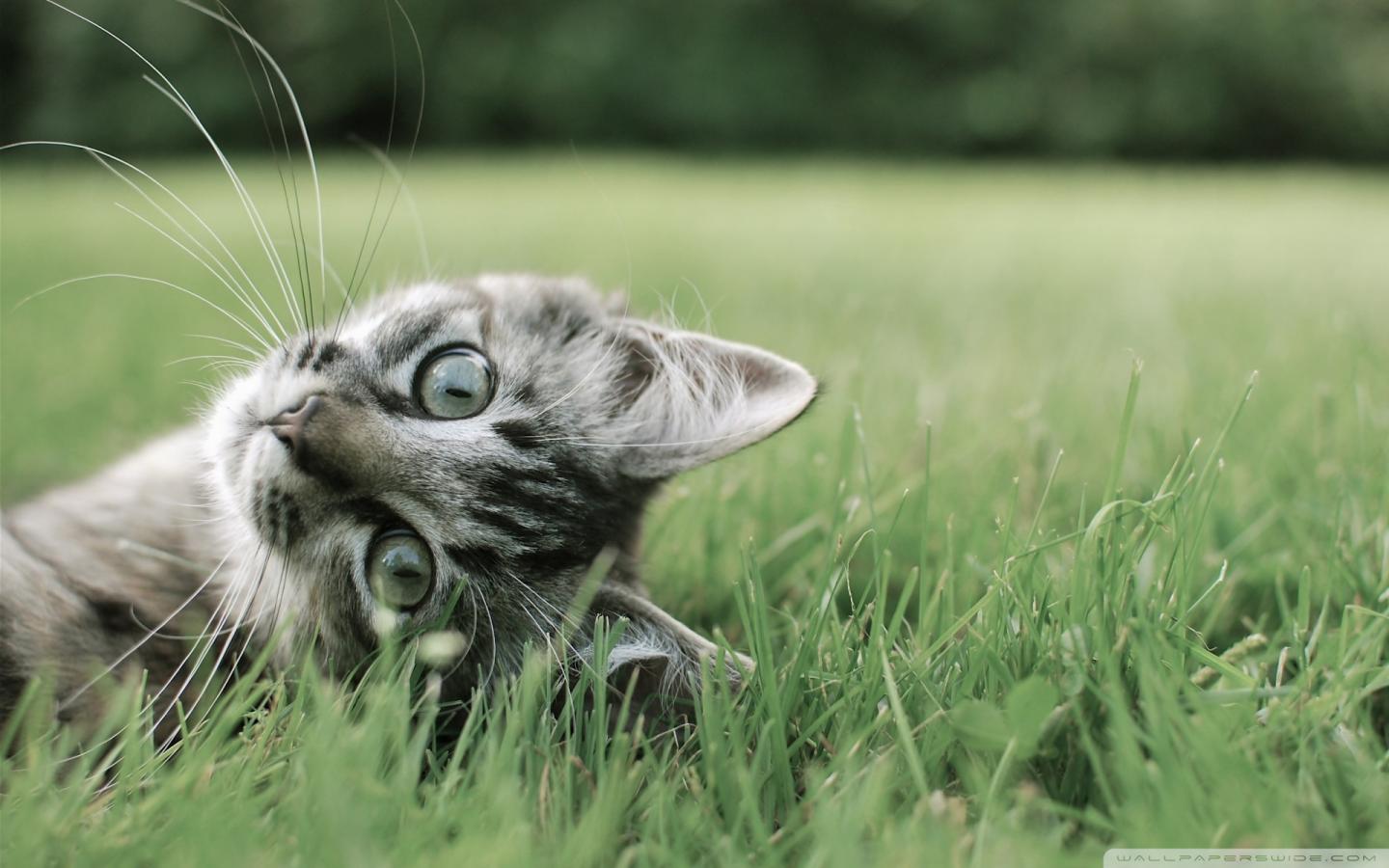 Серый котик в траве обои для рабочего стола, картинки, фото, 1440x900. | ||||||||||||||||