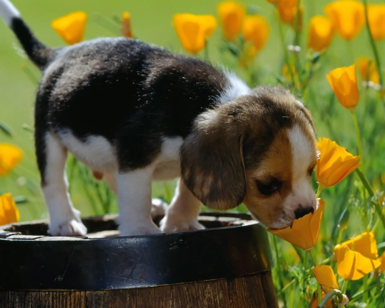 Симпатичный маленький щенок нюхает цветы, со щенками обои для рабочего стола, картинки, фото, 1280x1024. | ||||||||||||||||||||||