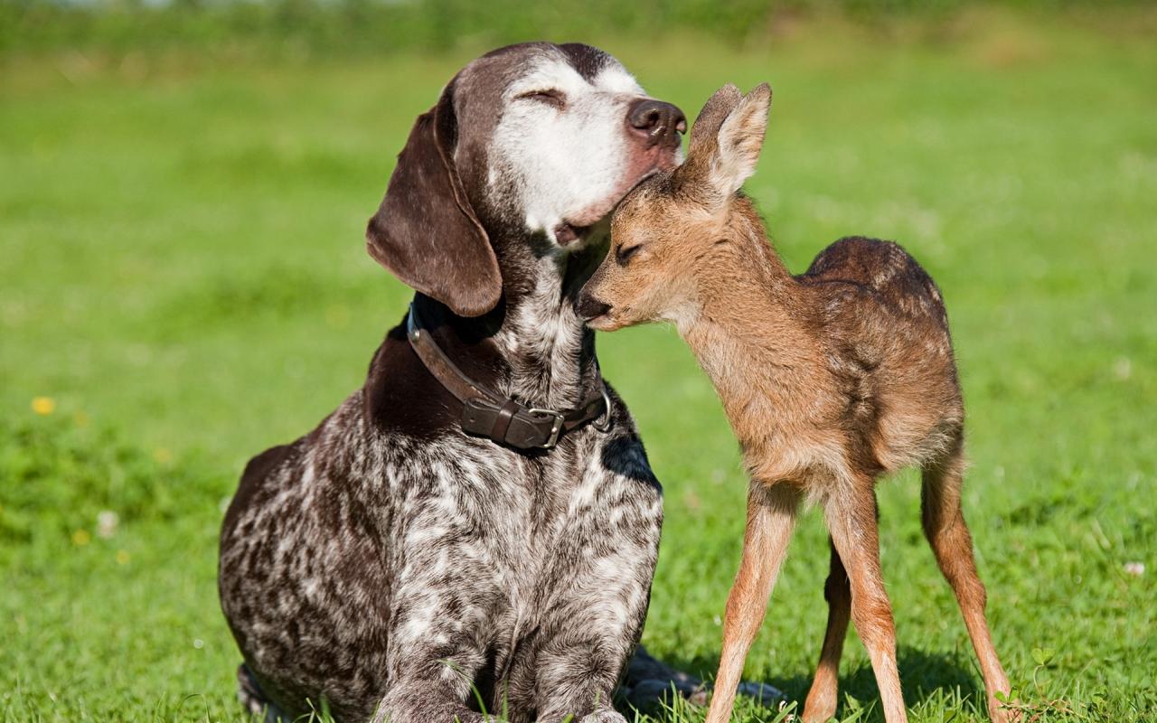 Собака и олененок обои для рабочего стола, картинки, фото, 1280x800. | ||||||||||||||||