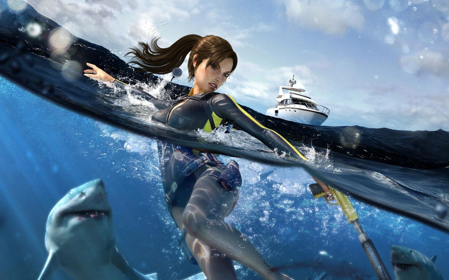 Лара Крофт в море обои для рабочего стола, картинки, фото, 1440x900. | ||||||||||||||||